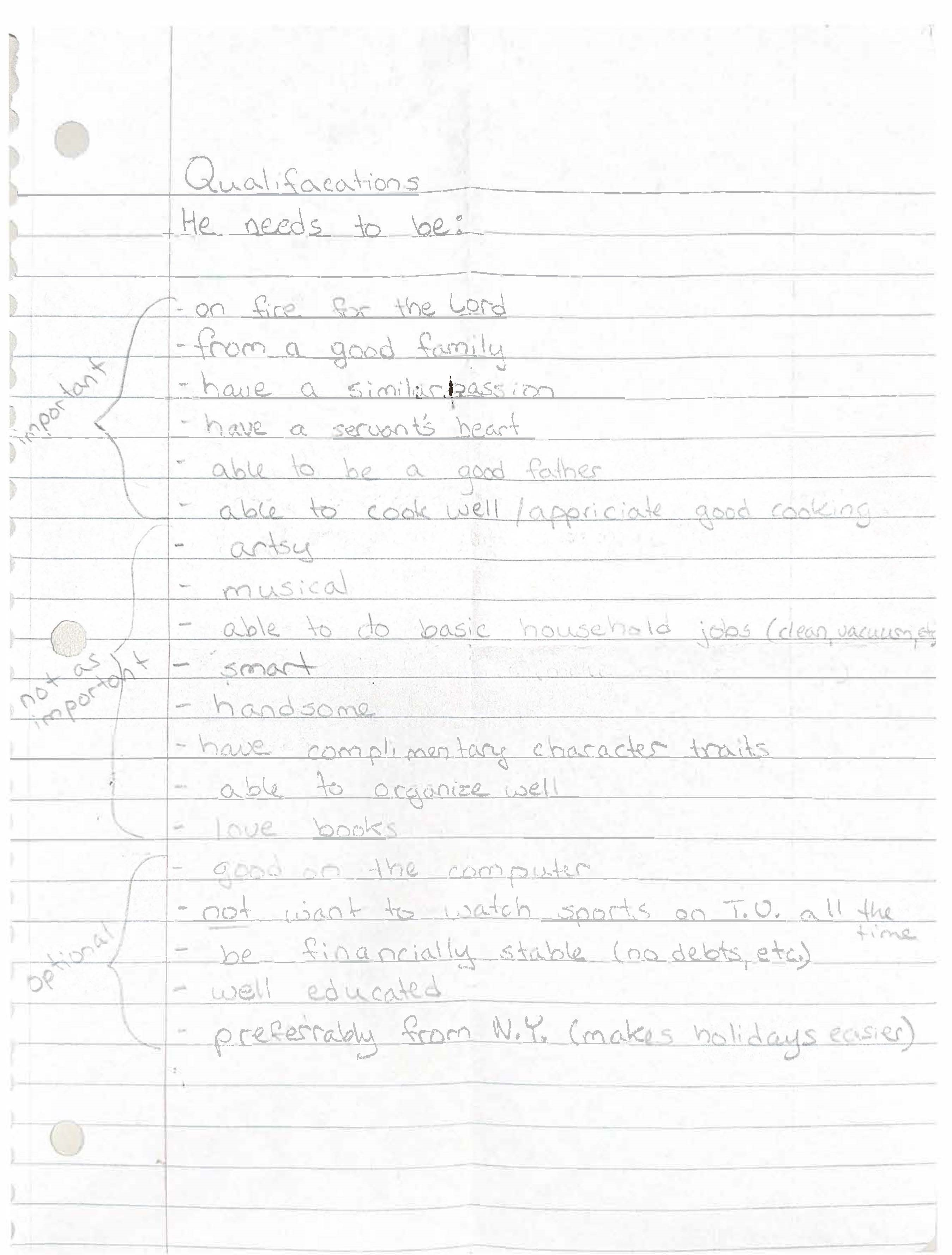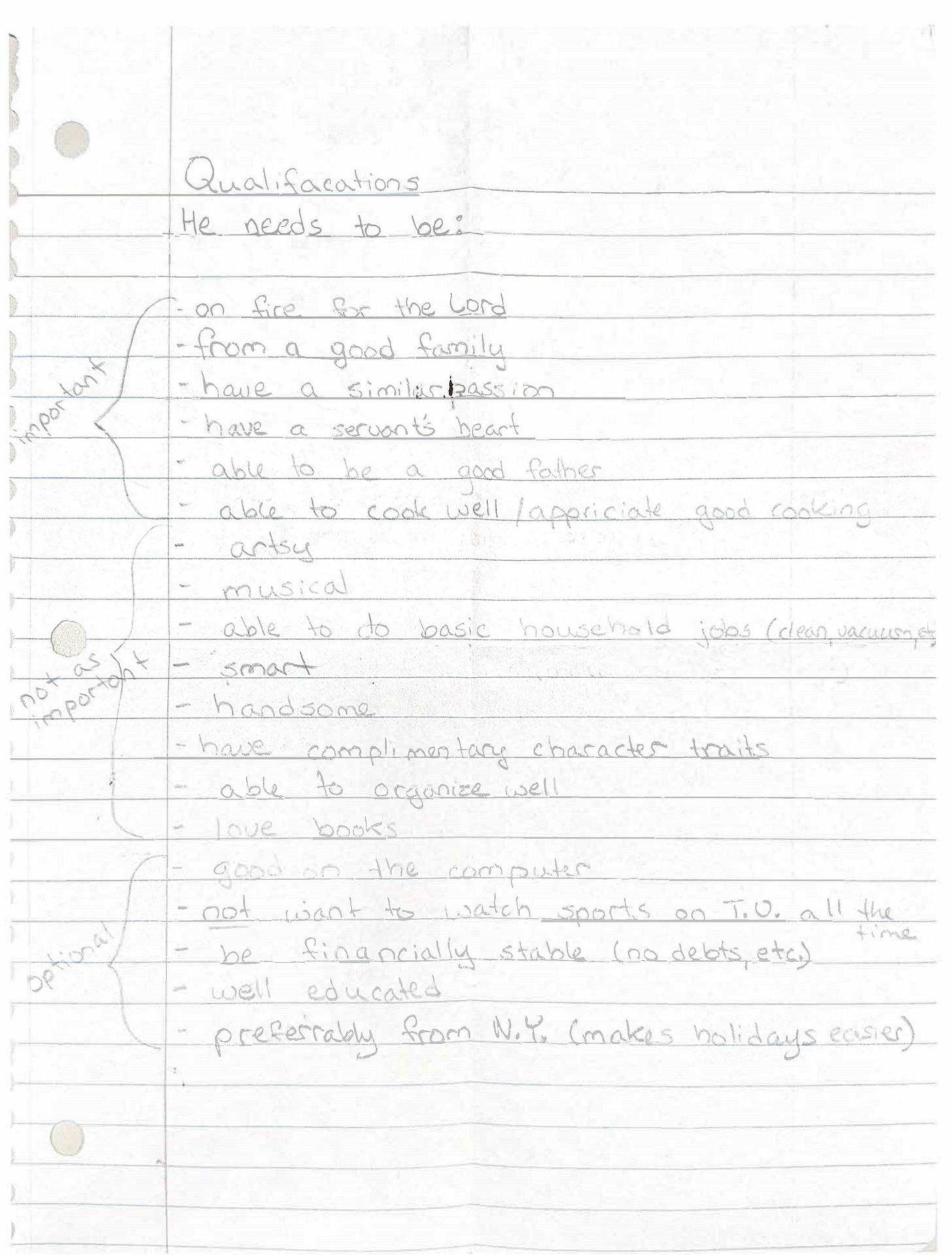 Twenty years later, I can see what I couldn’t see then—almost all of the husband qualifications in the “Important” category were dictated by what my parents wanted.